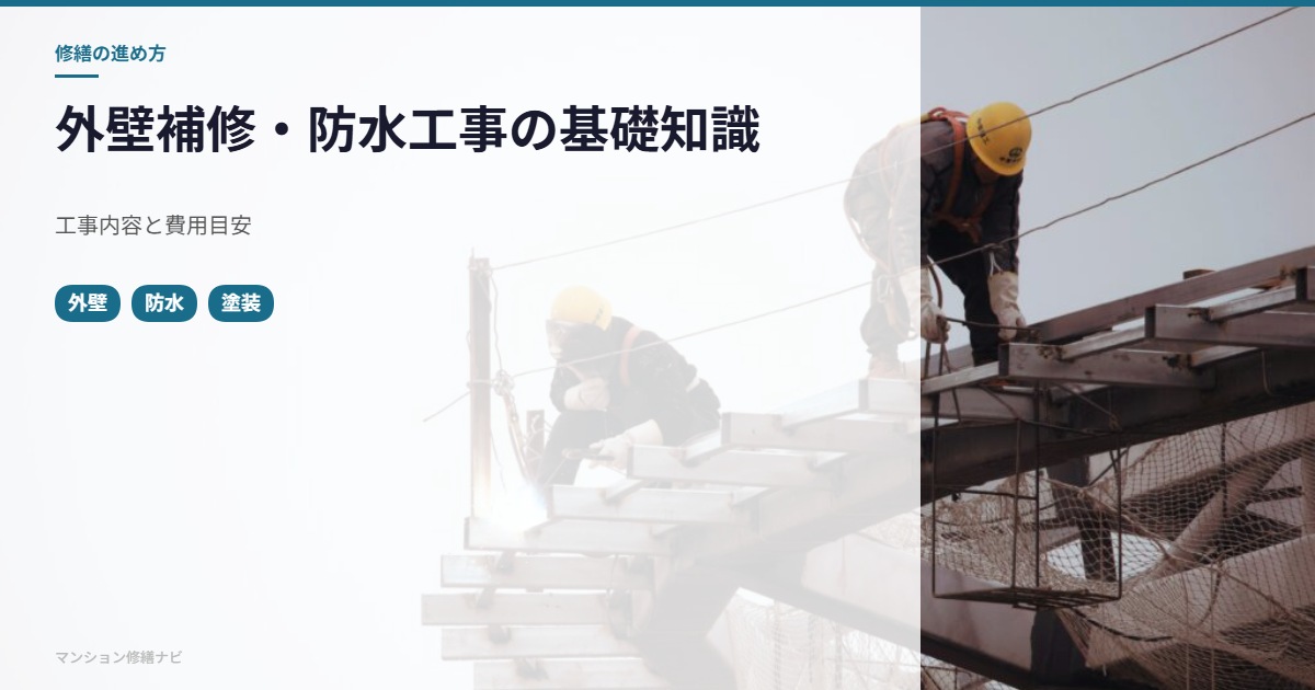 大規模修繕において最も大きな割合を占めるのが外壁補修と防水工事です。建物の耐久性と美観を維持するために不可欠な工事ですが、「何をどこまでやるべきか」「費用はどれくらいかかるのか」がわかりにくいのも事実です。本記事では、管理組合が知っておくべき外壁・防水工事の基礎知識を解説します。