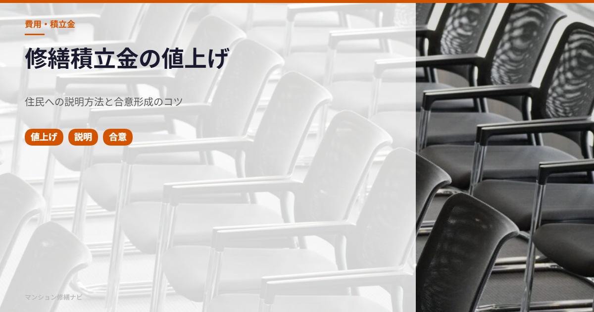 修繕積立金の値上げは避けて通れない課題ですが、丁寧な説明と合意形成のプロセスを踏めば、住民の理解を得ることは可能です。重要なのは「値上げありき」ではなく「建物を守るために何が必要か」という視点で住民と対話することです。大規模修繕の流れ全体を理解した上で、計画的に取り組んでいきましょう。