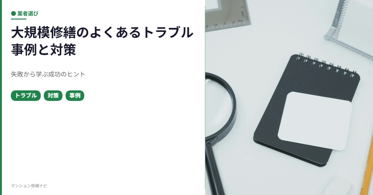 大規模修繕のトラブルの多くは、事前の準備不足やコミュニケーション不足が原因です。事前の建物診断で劣化状況を把握し、業者選定は価格だけでなく実績・体制・信頼性を総合的に判断しましょう。契約書で追加費用・保証・工期遅延の取り決めを明確にし、住民への情報公開を早い段階から丁寧に行うことが成功のカギです。