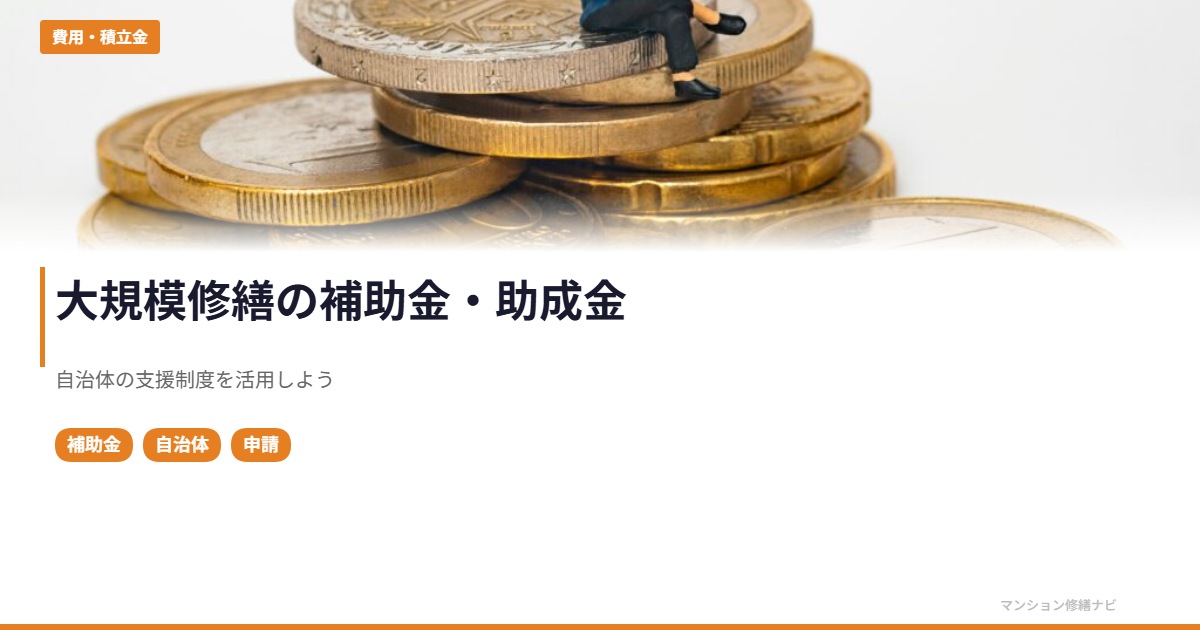 大規模修繕の費用負担を軽減する方法のひとつが、自治体の補助金・助成金の活用です。すべてのマンションが対象になるわけではありませんが、条件に合えば数十万〜数百万円の補助を受けられる場合があります。本記事では、主な支援制度の内容と申請のポイントを解説します。