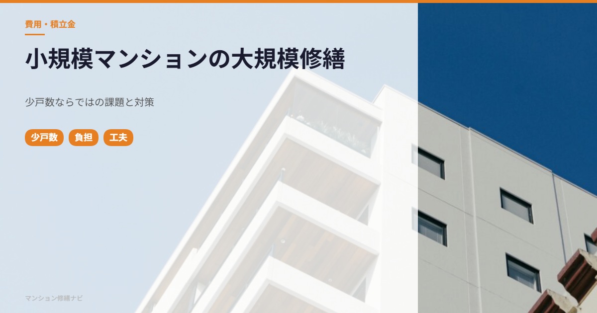 20戸以下の小規模マンションは、大規模修繕において独自の課題を抱えています。住戸数が少ないぶん1戸あたりの負担が大きくなり、管理組合の運営人材も限られます。しかし、小規模ならではの利点を活かせば、効率的な修繕も可能です。