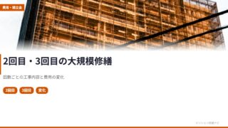 大規模修繕の回数と工事内容の関係マンションは完成後、最初の大規模修繕を迎える時点で既に相当な劣化が進行しています。その後も年月とともに劣化が進み、2回目、3回目の大規模修繕では、1回目とは異なる工事内容が必要になります。むしろ回数が増えるほ...