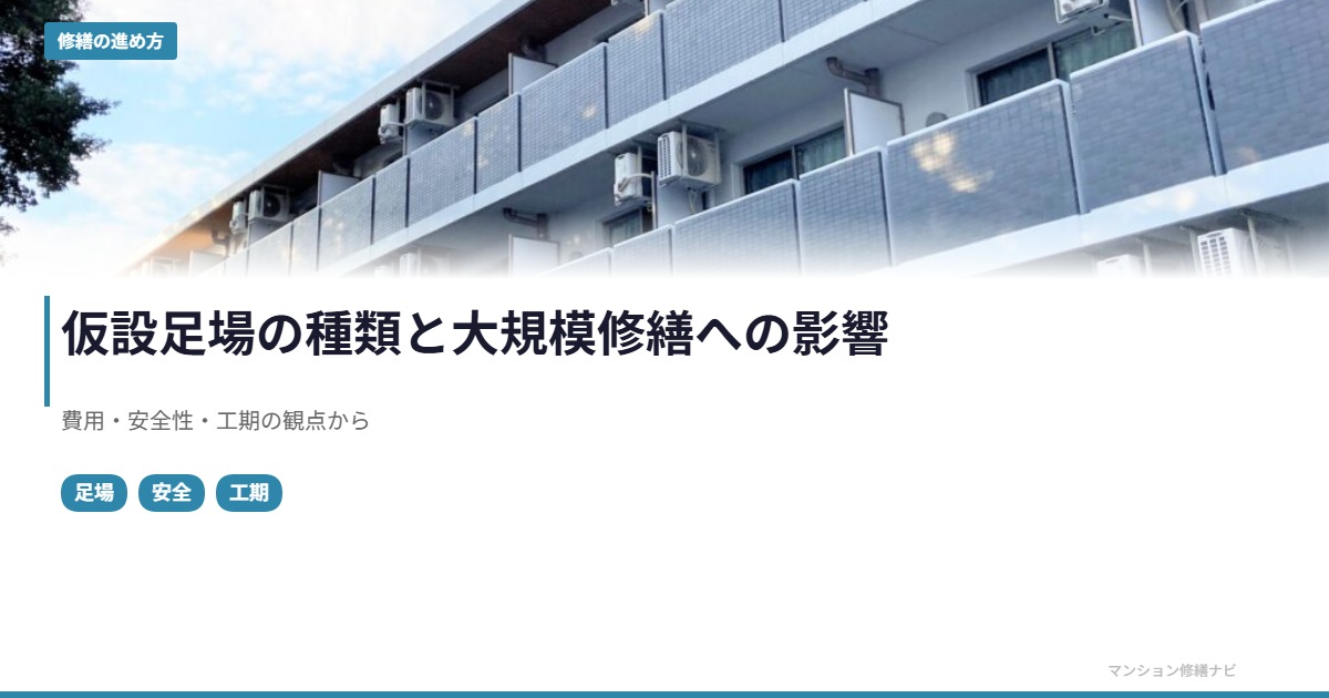 大規模修繕で最も目に見える存在が「仮設足場」です。工事期間中、マンション全体を足場が覆い、住民の視界をさえぎり、安全対策の要となります。この仮設足場の種類・費用・施工期間は、修繕計画全体に大きな影響を与えます。