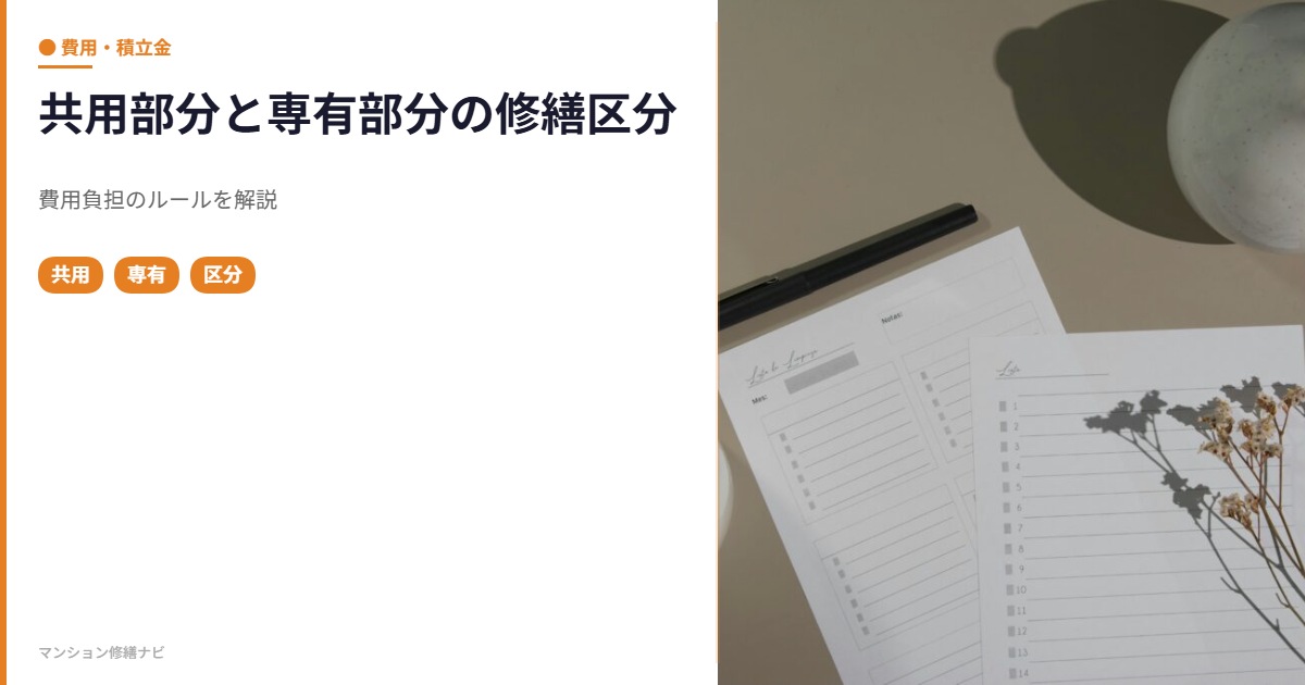マンションの修繕費用をめぐるトラブルの多くは、「この部分は誰が負担するのか」という区分の曖昧さから生じます。区分所有法では、マンションの部分を「共用部分」と「専有部分」に大別しており、修繕費用の負担ルールはこの分類によって決まります。